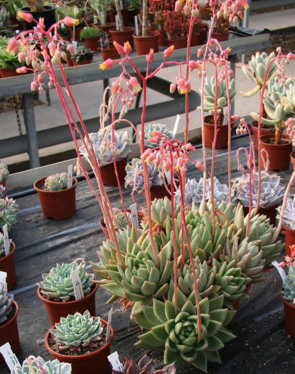 En été, les fleurs de l'Echeveria agavoides éclosent. La floraison a lieu au somment d'une tige de 50 centimètres avec des fleurs roses, orange ou rouges à pointe jaune foncé.