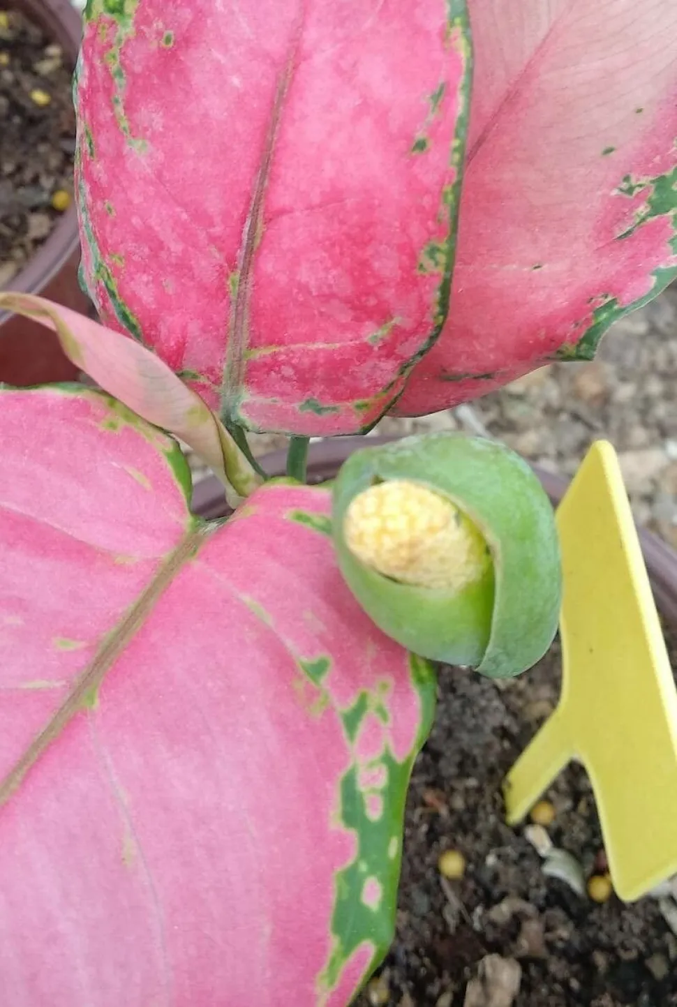 Na natureza, a Aglaonema commutatum floresce no verão. Nas cultivares e no interior, isto é muito mais raro. No entanto, podem aparecer espatas verdes ou brancas. Estas contêm as flores em espiga.